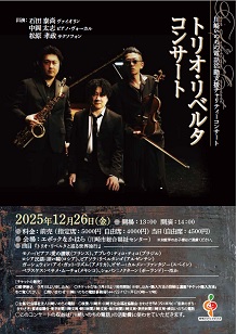 トリオ・リベルタ: 2000年結成。ヴァイオリニスト石田泰尚をはじめクラシックの第一線で活躍する3人による唯一無二のサウンドは、その独特な楽器編成からも斬新な音を生み出す。その活動はクラシックの枠にとらわれず国内最大級のジャズイベント「横濱JAZZプロムナード」への出演や、神奈川県民ホール主催の単独野外コンサートでも圧倒的な演奏で話題を呼んだ。近年はクラシック、映画音楽、ジャズ、タンゴなどの作品にも意欲的に取り組み、オリジナル・アレンジによるレパートリーは200曲を超える。コンサートは全国各地で展開し、老若男女より幅広く支持されている。川崎・しんゆり芸術祭「アルテリッカしんゆり」へはこれまでに最多10回の出演。2枚のアルバムをリリース。 |